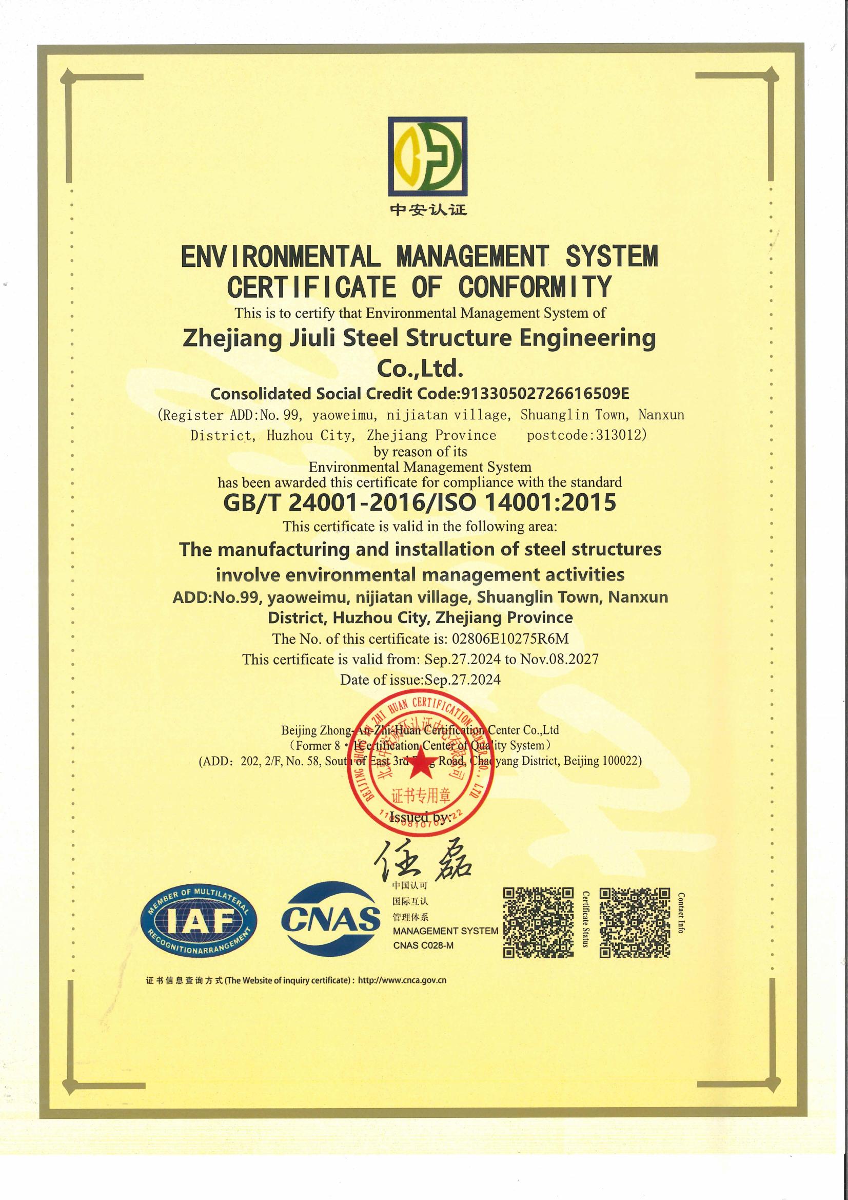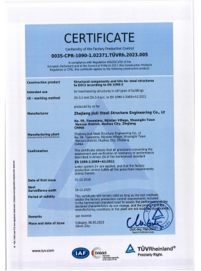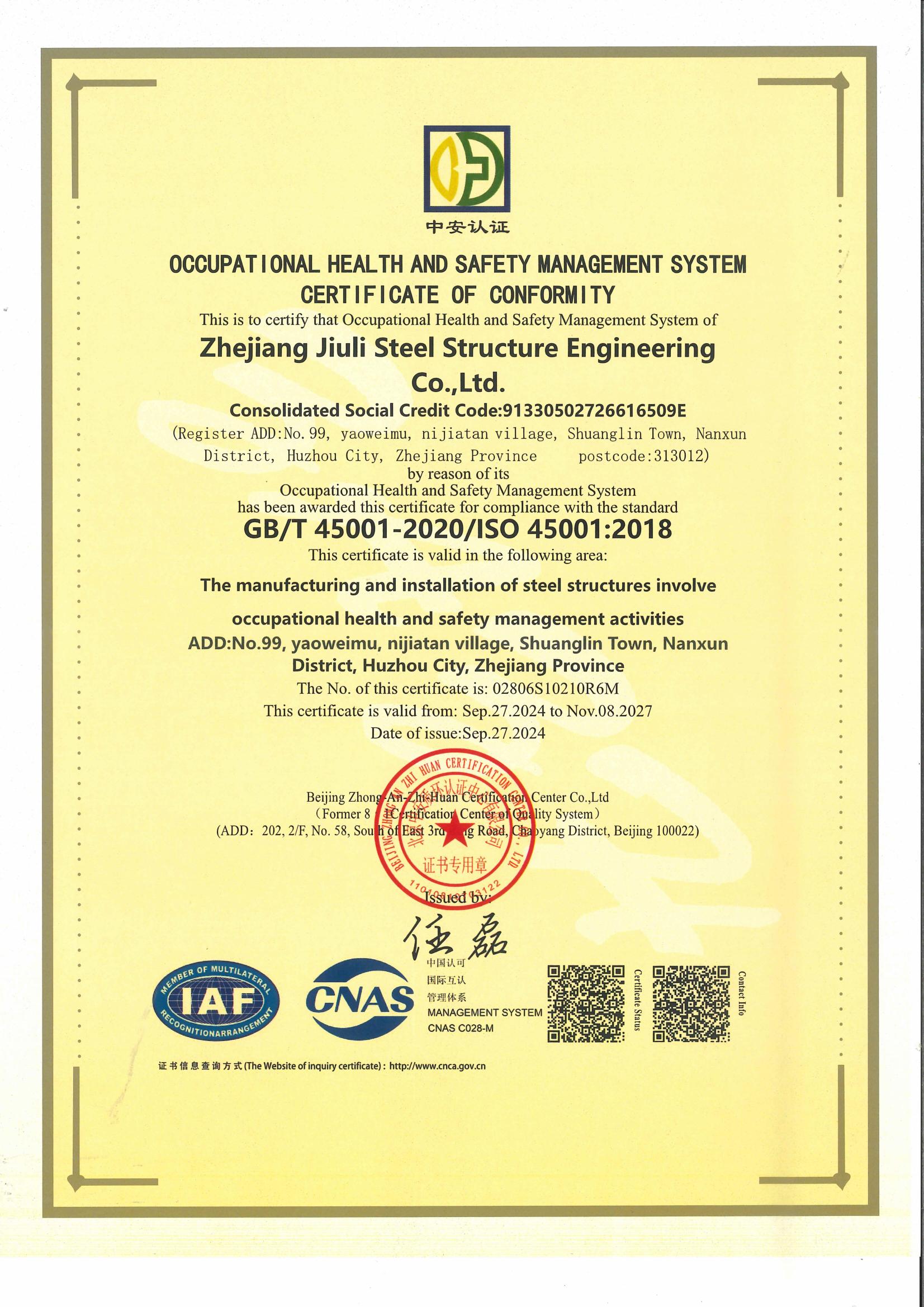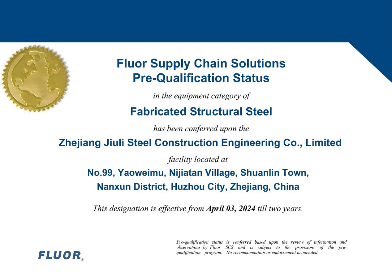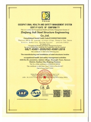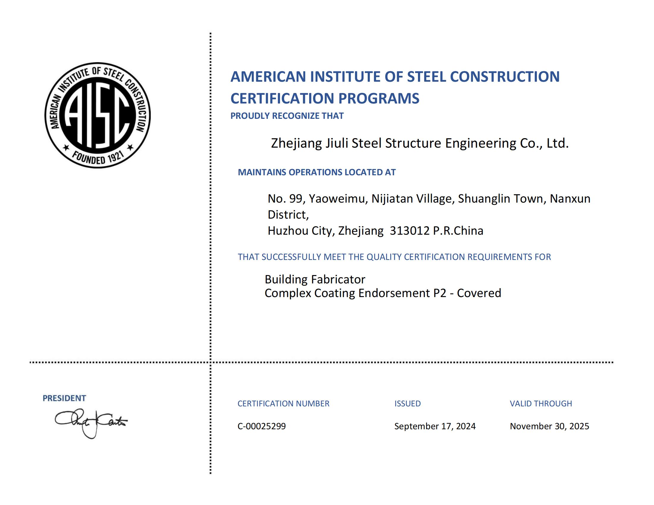 Zhejiang Jiuli Steel Structure Engineering Co., Ltd., founded in February 2001, is based in Huzhou City, the core area of the booming economy of the Yangtze River Delta in China. As a wholly-owned subsidiary of Jiuli Group, our company has not only been awarded honors such as Contract-abiding and Credit-worthy Unit, High-tech Enterprise, and AAA Credit Enterprise in Huzhou City but also holds important memberships in the China Steel Structure Association and the Steel Structure Branch of the Zhejiang Construction Industry Association, demonstrating our authoritative position and outstanding influence in the industry.