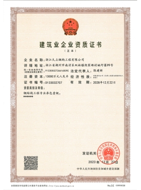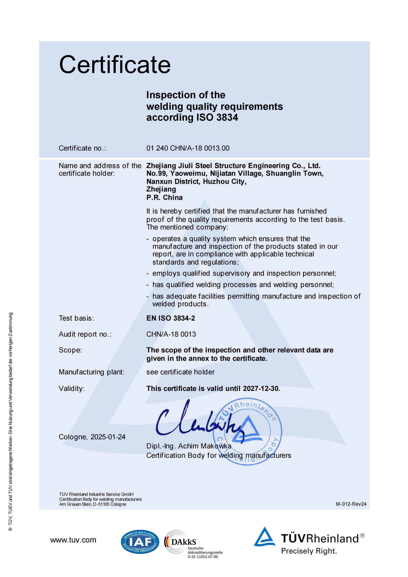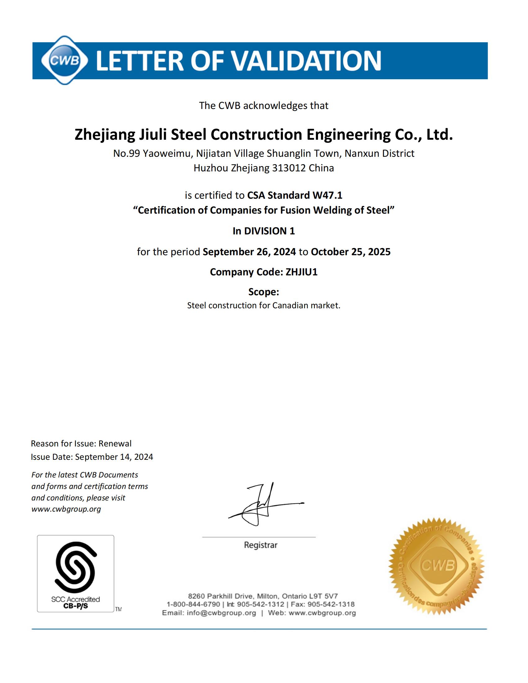 The company has a comprehensive quality assurance system and has passed the certification of ISO9001:2015 quality assurance system. Having the second level general contracting qualification for construction projects, the first level professional contracting qualification for steel structures, and the special manufacturing qualification issued by the Ministry of Construction. We specialize in undertaking the construction of various industrial and civil engineering projects, as well as the design, manufacturing, and installation of steel structures. The company is based in the domestic market and has established multiple marketing offices nationwide, gradually forming a nationwide marketing network and actively participating in international competition. The company has the Canadian CWB certificate, American AISC certificate, European EN1090 and ISO3834 certificate certified by the Canadian Welding Association, and can undertake the export processing of steel components with special requirements from Europe, America, Australia, and other countries. It has successfully established branches in Madagascar and Botswana in Africa. Jiuli Steel Structure is one of the first construction enterprises in the Huzhou region to enter the international market.